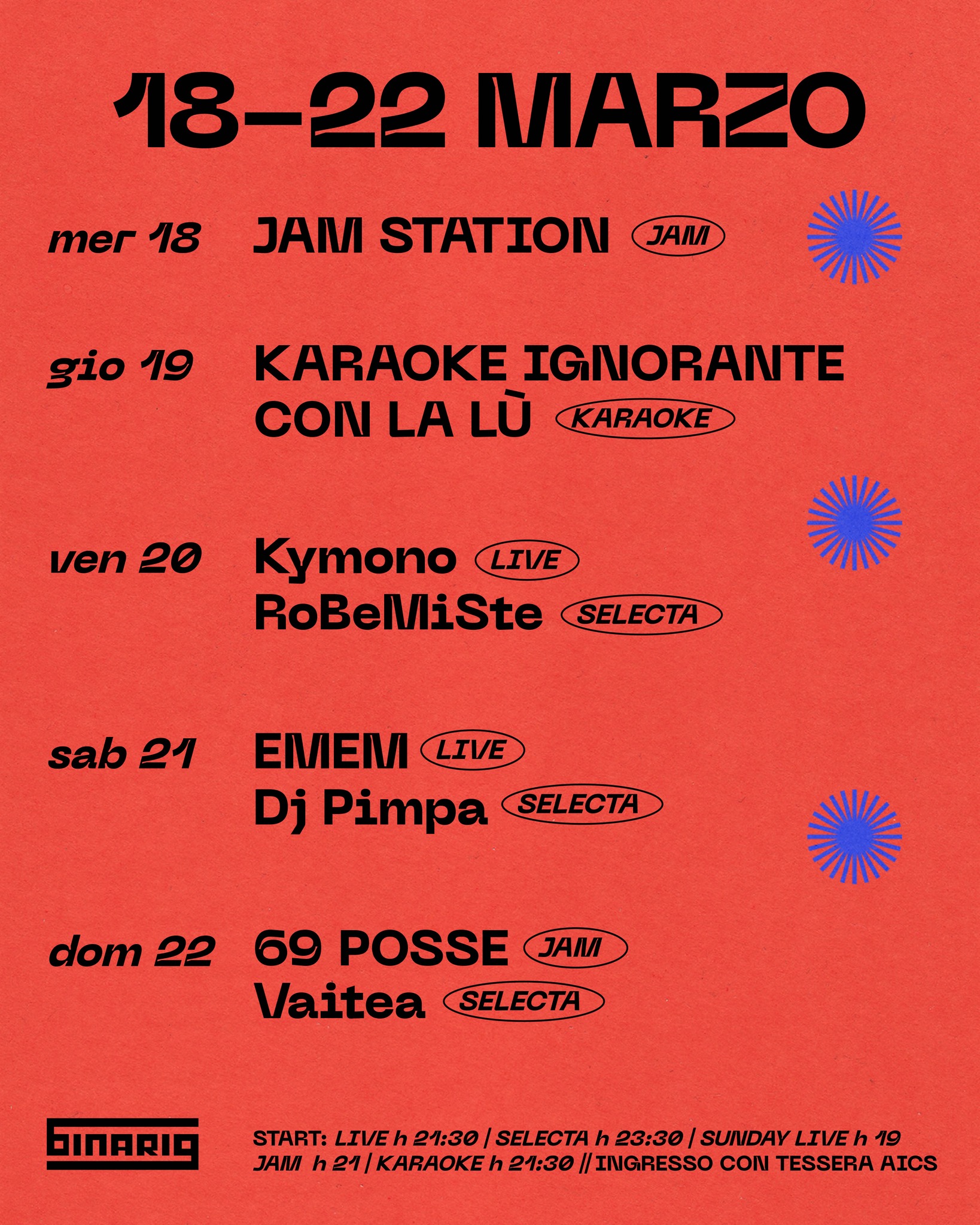 Programma eventi Binario69 dal 18-22 marzo: mer 18 JAM STATION JAM, gio 19 KARAOKE IGNORANTE CON LA LÙ, ven 20 KyMono LIVE RoBeMiSte SELETA, sab 21 EMEM LIVE DJ Pampa SELETA, dom 22 69 POSSE JAM Vaitea SELETA