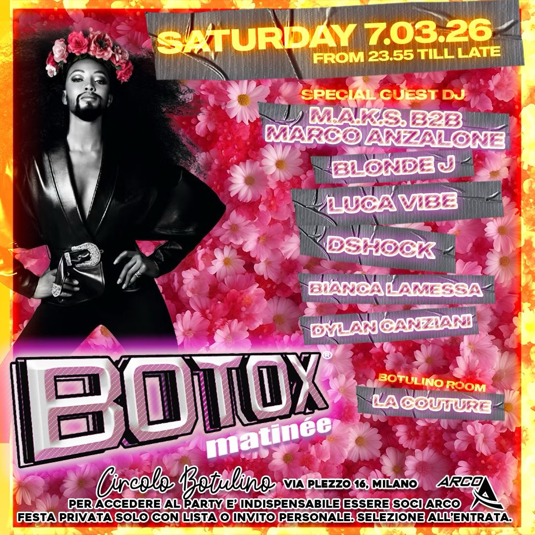 BOTOX Matinée: Serata con DJ set (M.A.K.S. b2b Marco Anzalone, Blonde J, Luca Vibe e altri). Party privato con selezione all'ingresso, riservato ai soci ARCO.