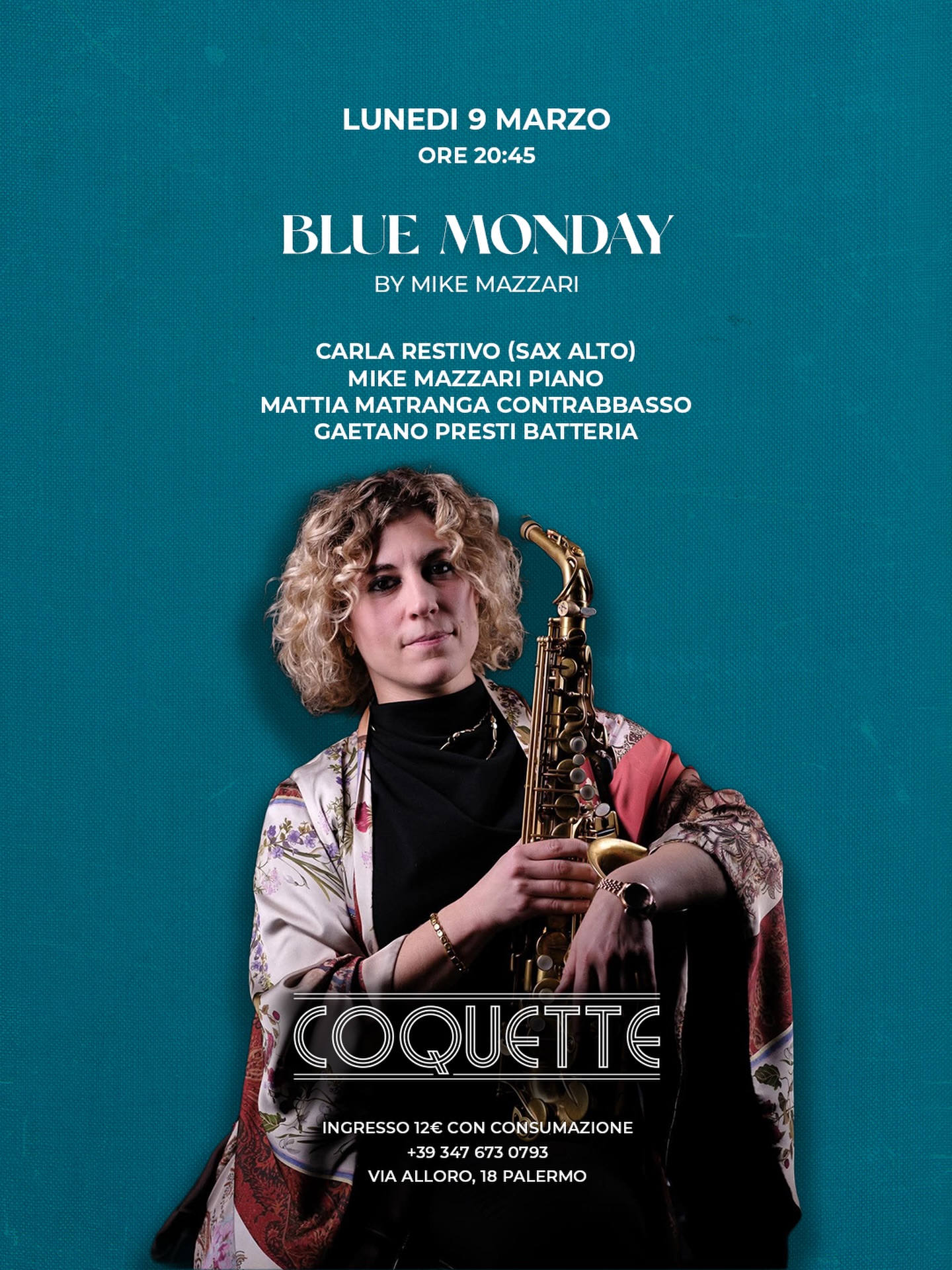 Serata jazz 'Blue Monday' con quartetto di Mike Mazzari: Carla Restivo (sax alto), Mike Mazzari (piano), Mattia Matranga (contrabbasso), Gaetano Presti (batteria). Ingresso con consumazione e drink.