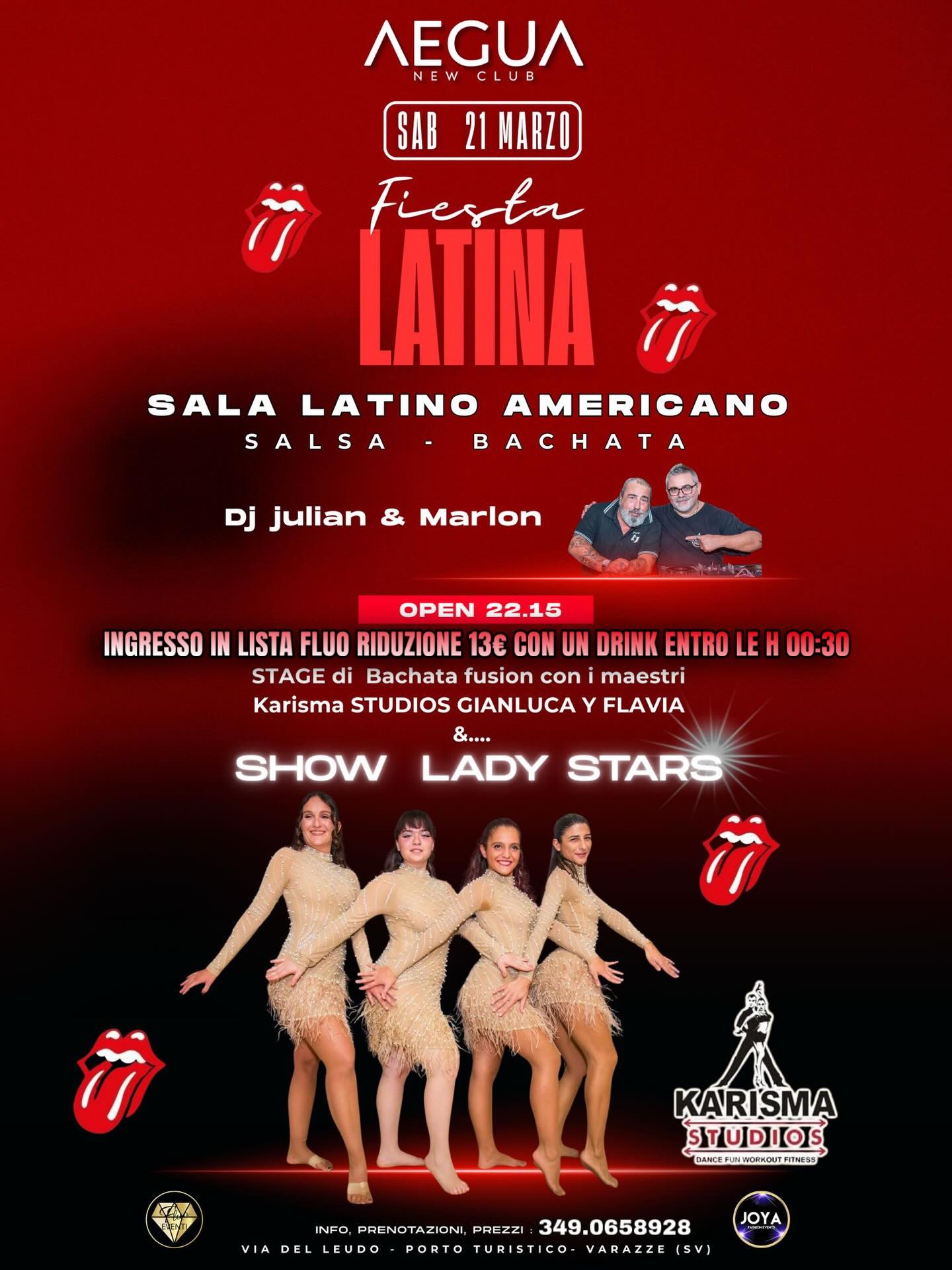 Fiesta Latina Aegua con corso di Salsa livello intermedio, sala Bachata & Salsa con DJ Julian & Marlon e Show Lady Stars