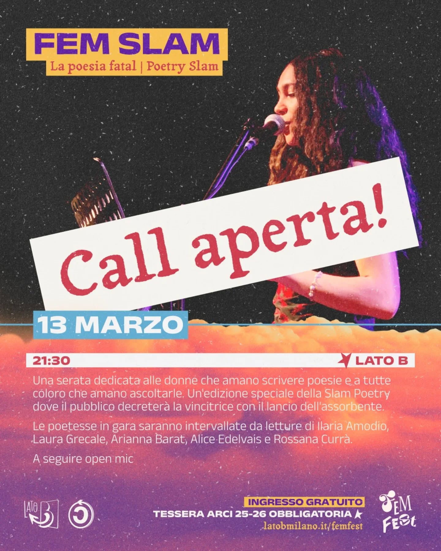 FEM SLAM - Edizione speciale di poetry slam dedicata a donne e persone non binary. Serata con contest a due round dove il pubblico decreta la vincitrice con il lancio dell'assorbente, intervallata da letture di Ilaria Amodio, Laura Grecale, Arianna Barat, Alice Edelvais e Rossana Currà, seguita da open mic.
