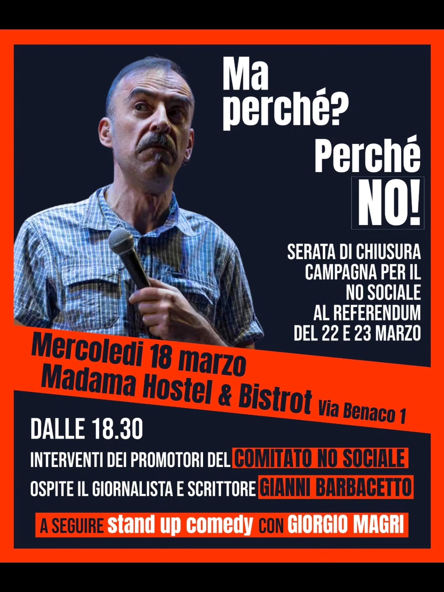 Serata di incontro e confronto sulle ragioni del No sociale al referendum con interventi del Comitato No Sociale, Gianni Barbacetto e stand up comedy con Giorgio Magri