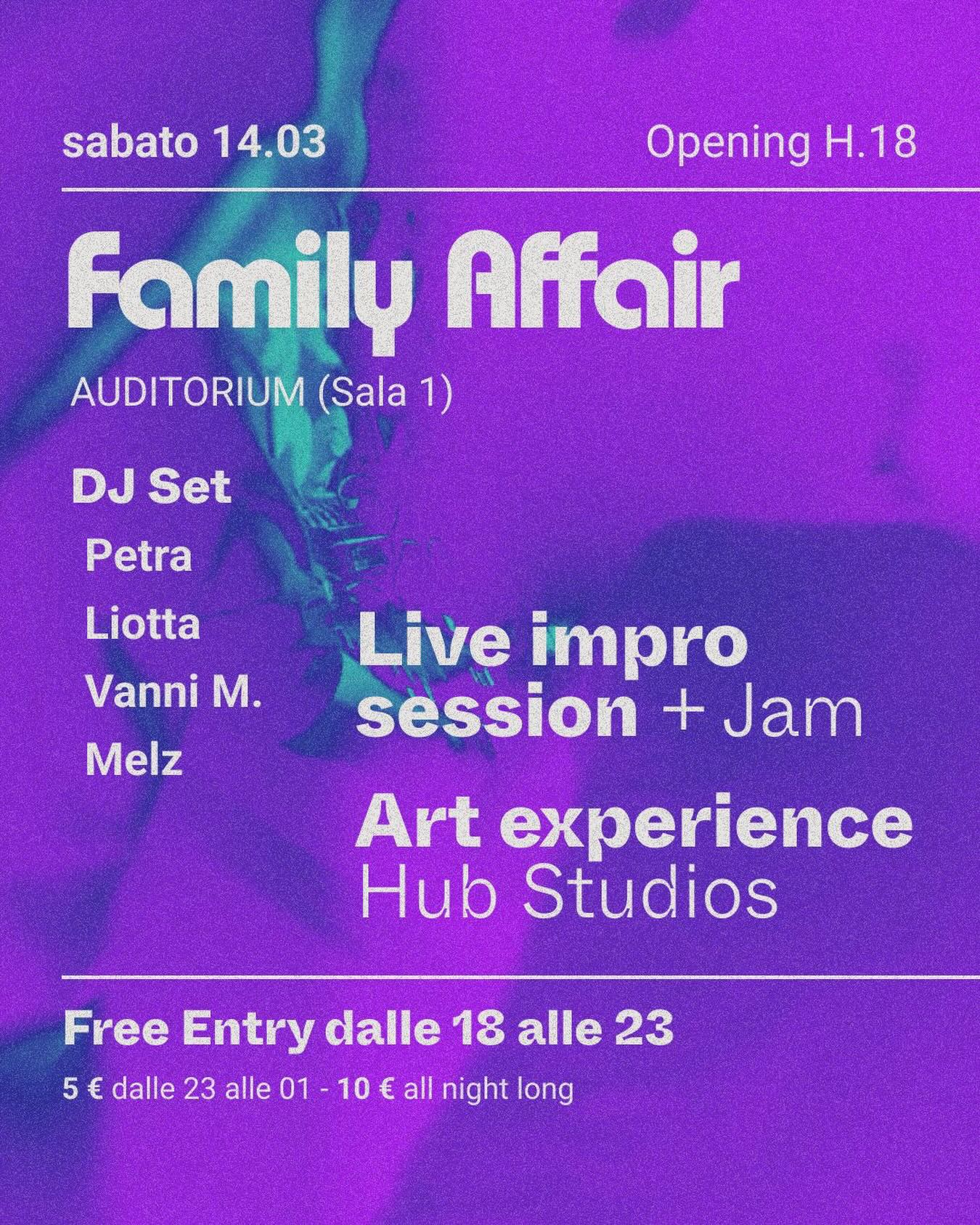 Family Affair: installazioni Hub Studios, live impro session + jam e DJ set con Petra, Liotta, Vanni M., Melz