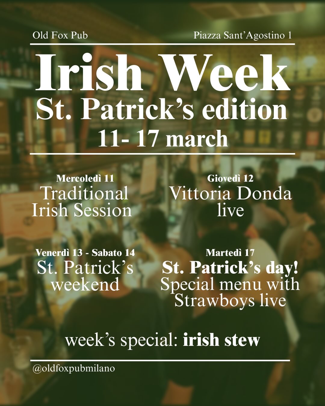 Irish Week - St. Patrick's edition: una settimana di eventi con musica live, sessioni tradizionali irlandesi e menu speciale con Irish Stew.
