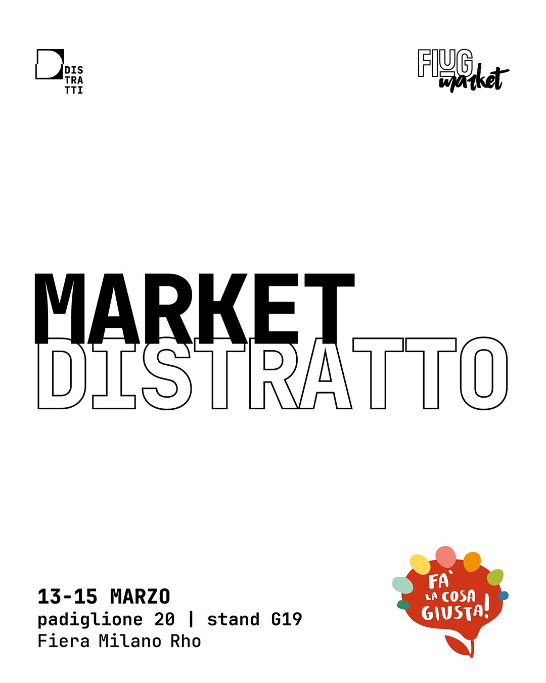 Market Distratto all'interno di Fa’ La Cosa Giusta: fiera del consumo critico e degli stili di vita sostenibili con esposizione di artigianato, ceramica, moda etica e illustrazioni.