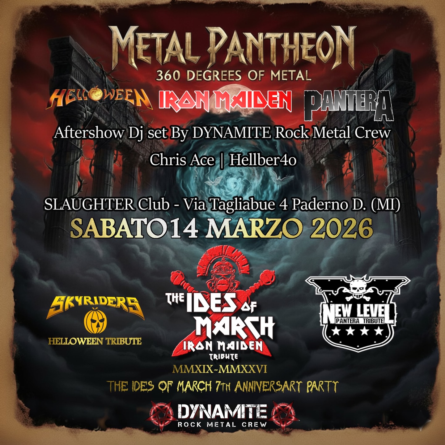 Metal Pantheon 360 Degrees of Metal con tribute band Pantera (New Level), Helloween (Skyriders), Iron Maiden (The Ides of March) e aftershow DJ set
