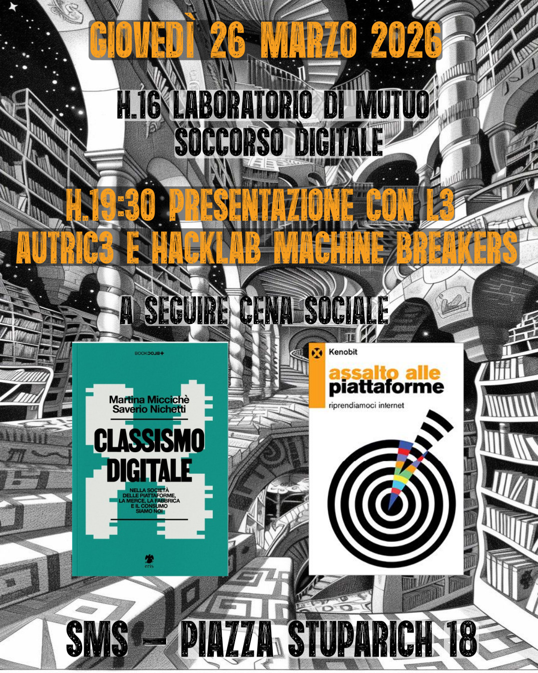 Laboratorio di mutuo soccorso digitale, presentazione libri 'Assalto Alle Piattaforme' e 'Classismo digitale' con Martina Micciché, Saverio Nichetti, Kenobit e hacklab Machine Breakers, cena sociale a offerta libera